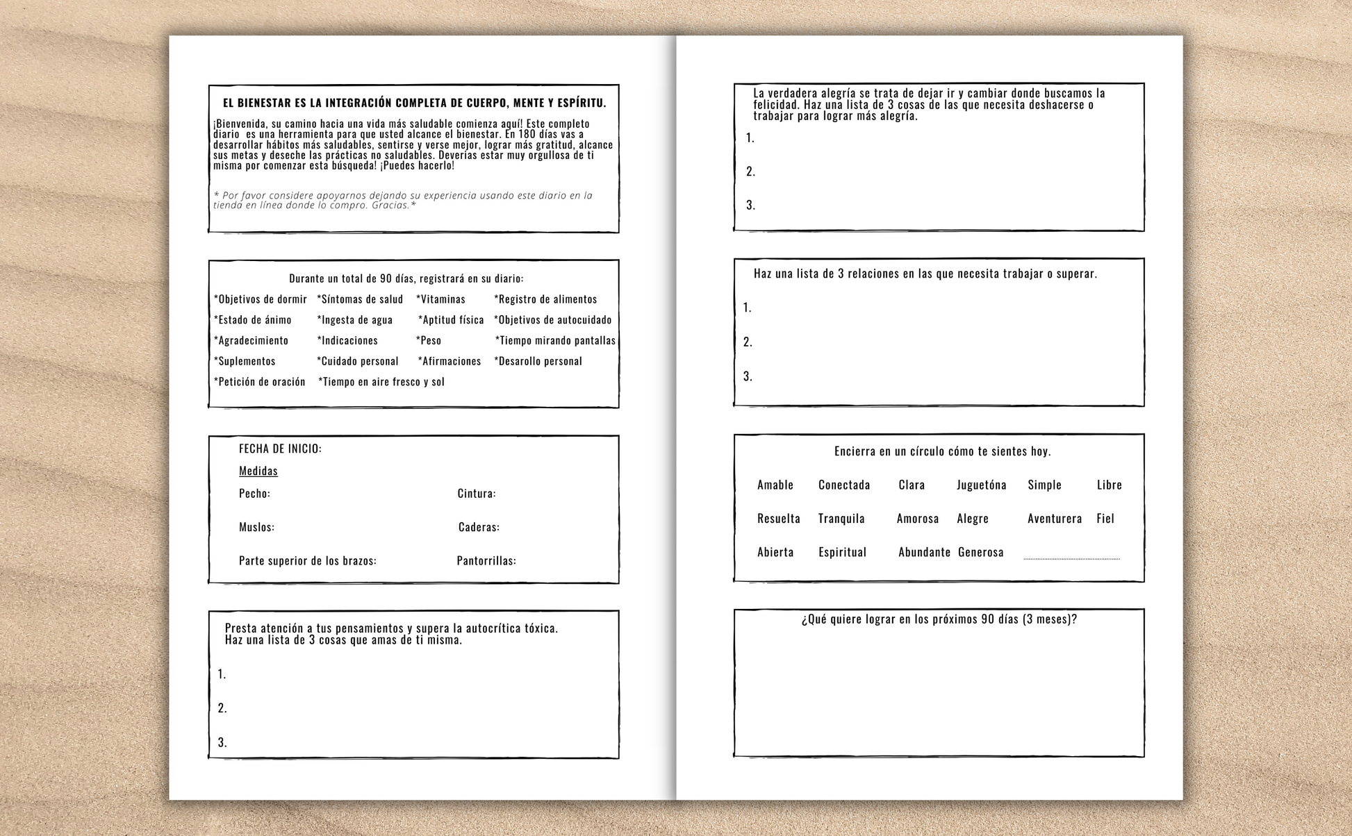 El popular diario en ingles ahora esta disponible en español. Este diario de bienestar esta brillante floriado y hermoso 196 páginas de alta calidad suficientes para registrar 90 días (dos páginas por día).