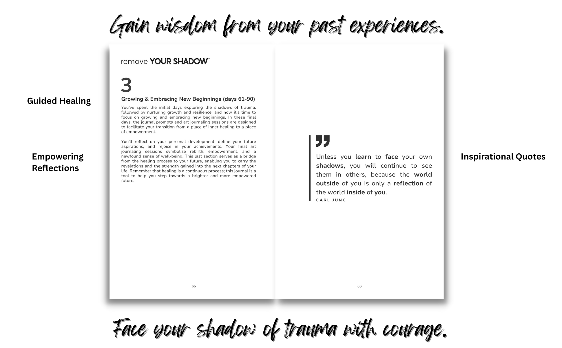 This 90-day journal offers a unique blend of journal prompts and therapeutic art journaling sessions, each thoughtfully crafted to help you remove your shadow of trauma.