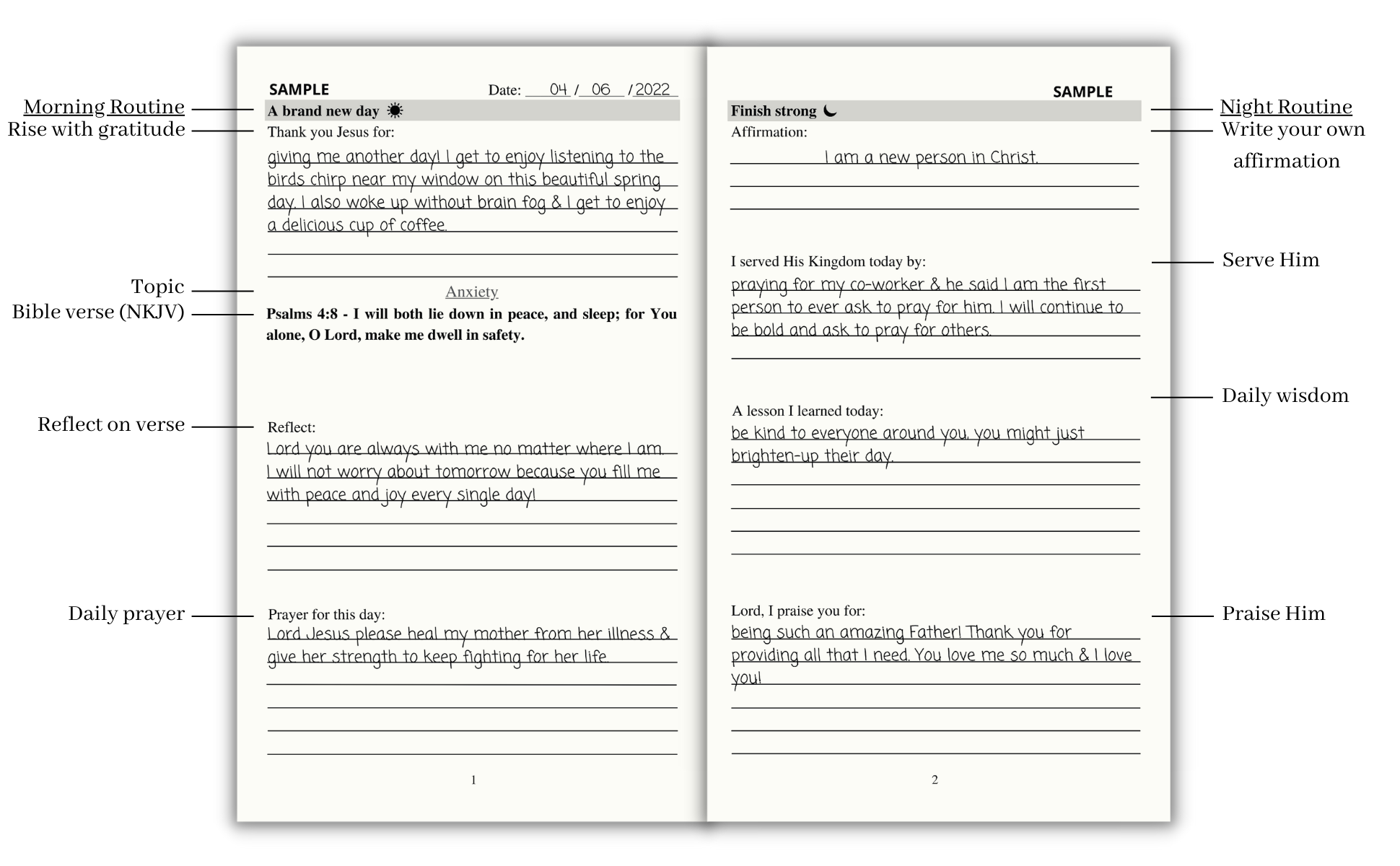 The 7 Minute Journal for Christians is a faith building tool that establishes a daily journaling routine including: